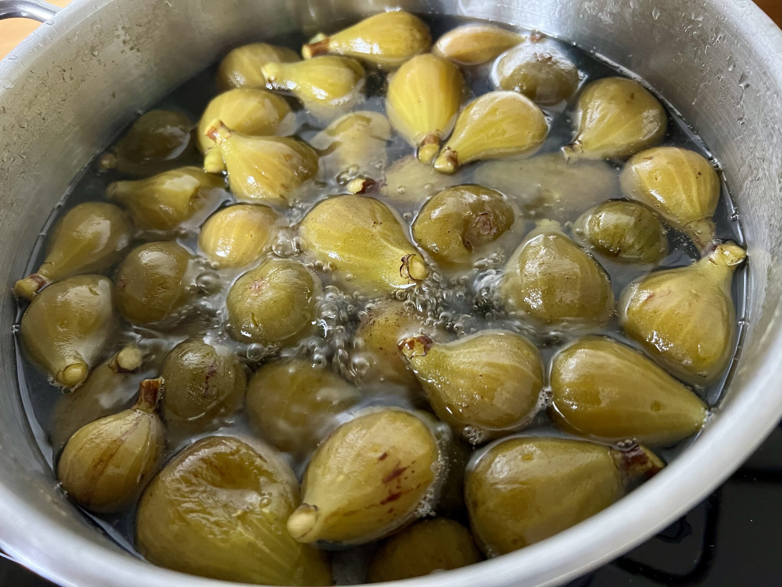 Dann werden die Feigen im Kochtopf mit Wasser bedeckt und ca. 15 Minuten gekocht. Dann abgießen und abschrecken und den Vorgang noch zweimal wiederholen.
